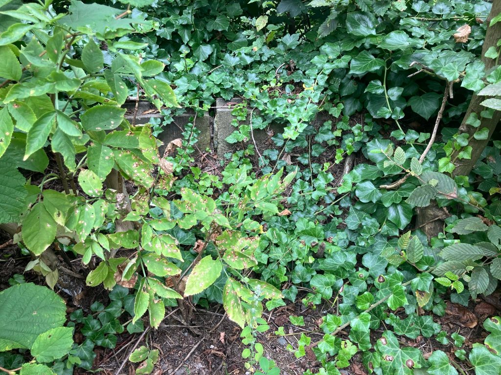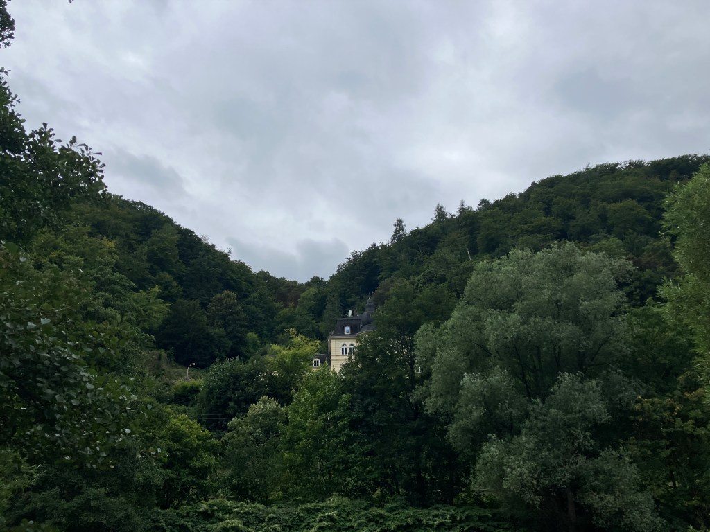 Die Villa und die Stützmauer des ehemaligen Denkmalsplatzes sind von der gegenüberliegenden Straßenseite aufgrund der dichten Vegetation nur noch schemenhaft zu erkennen.