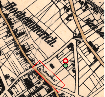 Über das Geo-Portal der Stadt Duisburg ließ sich der ehemalige Standort des Denkmals ermitteln. Es stand in einer Ecke des Hochemmericher Marktplatzes, an der Kreuzung von Atroper Straße und Duisburger Straße.4