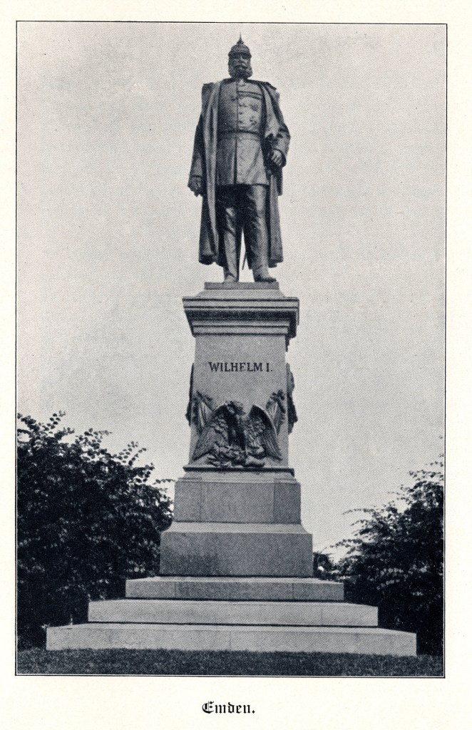 Das Kaiser-Wilhelm-Denkmal in Emden fand einen prominenten Platz direkt vor dem Rathaus der Stadt. Flankiert wurde das Kaiser-Standbild von zwei später aufgestellten Standbildern von Friedrich dem Großen und Kurfürst Friedrich Wilhelm.