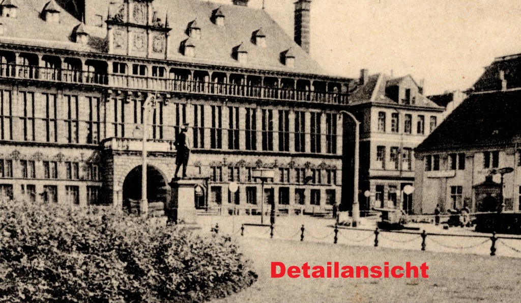 Durch das im modernen Stil wieder aufgebaute Rathaus und die städtebauliche Erhaltung des Rathausplatzes lässt sich der ehemalige Denkmalsplatz leicht bestimmen.